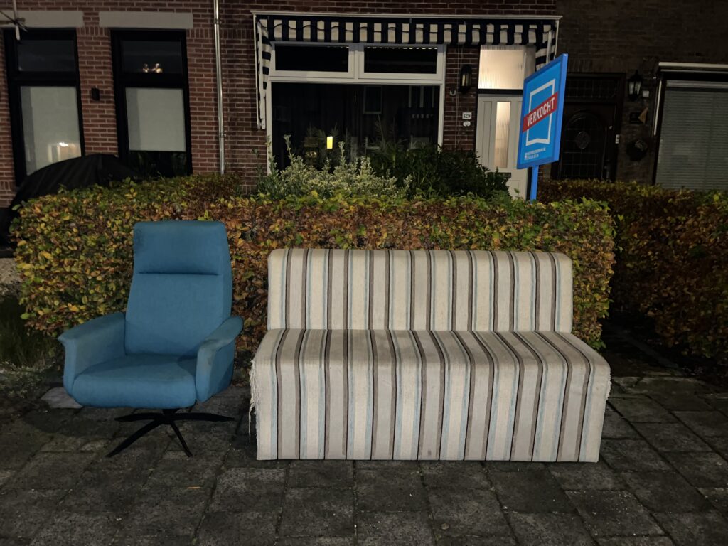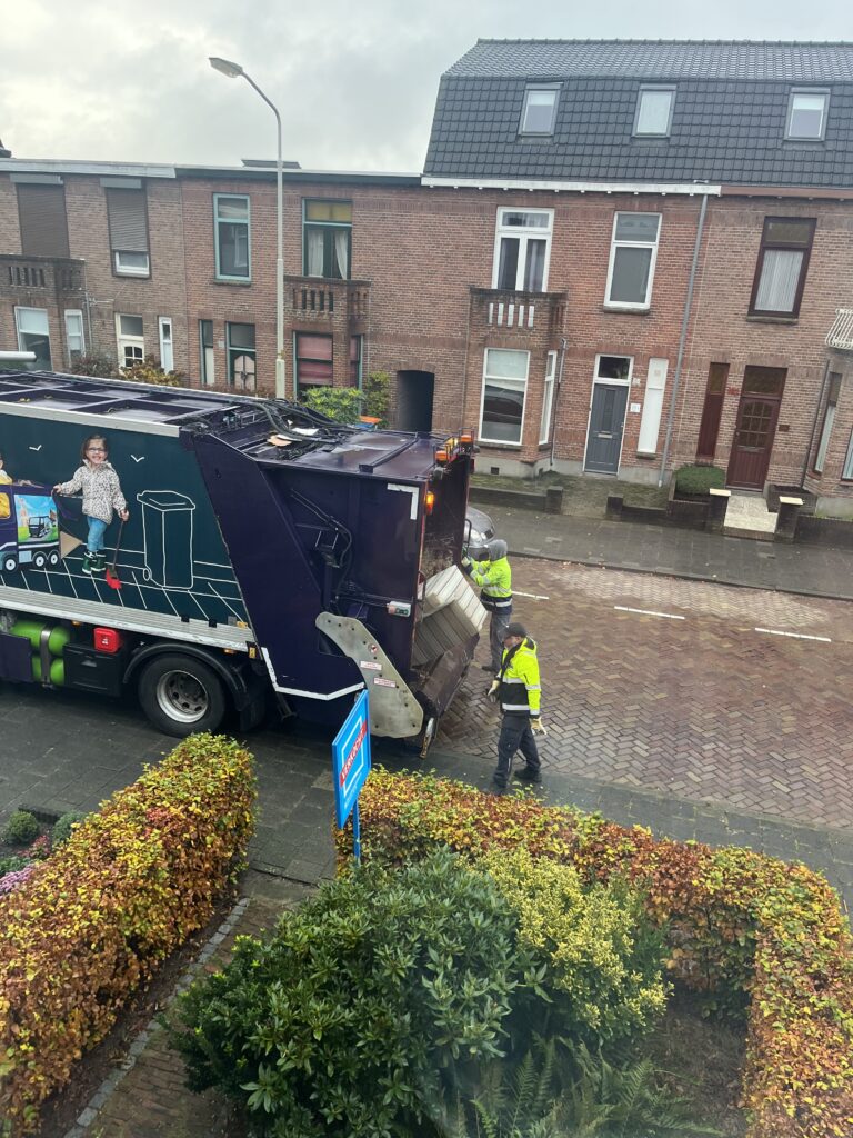 Ook mijn favoriete ligstoel en het hippe en leuke tafelbankje waren dermate versleten dat we ze niet anders konden dan afstorten. Na een afspraak bij de gemeente te hebben gemaakt werden ze gisteren opgehaald. En waar wij nog in al onze onschuld dachten dat er misschien een nieuwe eigenaar voor werd gevonden, werd onze droom tesamen met het meubilair zonder enige scrupules voor onze neus samengeperst en vermorzeld door de ongenadige hydroliek van de vuilniswagen.